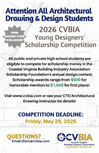 The Young Designers' Scholarship Competition is a house design contest for high school students interested in drafting, architecture or home building. The competition is open to any student enrolled in a public or private secondary school from the Cities of Chesapeake, Franklin, Hampton, Newport News, Norfolk, Poquoson, Portsmouth, Suffolk, Virginia Beach and Williamsburg, and the Counties of Accomack, Gloucester, Isle of Wight, James City, Mathews, Northampton, Southampton and York. You do not have to be a senior to participate!
